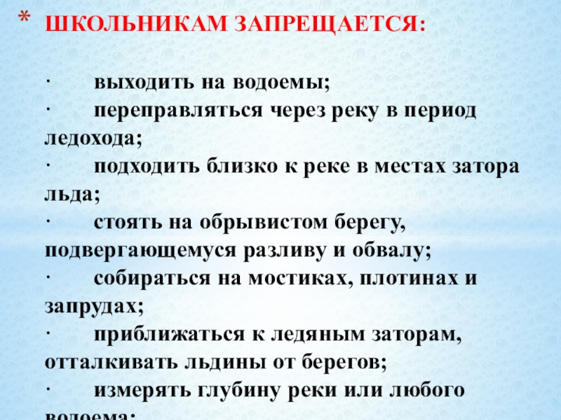 ШКОЛЬНИКАМ ЗАПРЕЩАЕТСЯ:   ·       выходить на водоемы; ·       переправляться через реку в период ледохода; ·       подходить близко к реке в