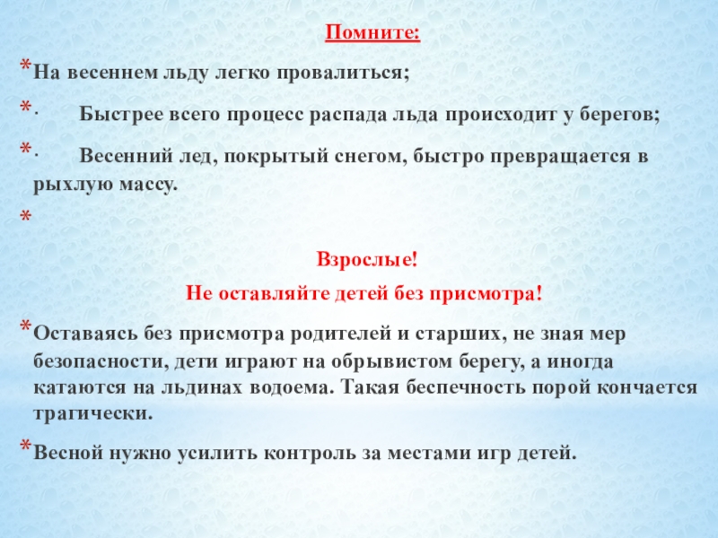Помните:На весеннем льду легко провалиться;·       Быстрее всего процесс распада льда происходит у берегов;·       Весенний лед, покрытый снегом, быстро превращается