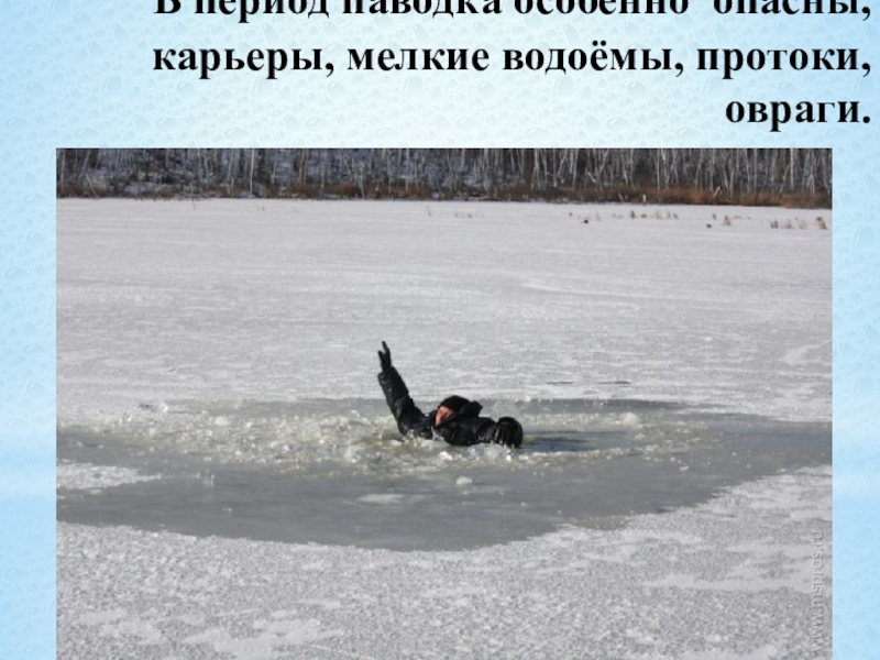 Слайд 2В период паводка особенно опасны, карьеры, мелкие водоёмы, протоки, овраги.