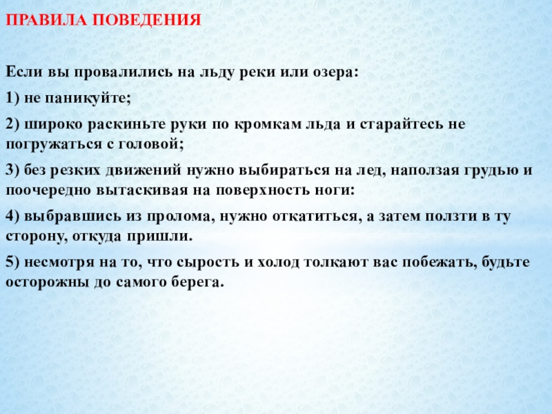ПРАВИЛА ПОВЕДЕНИЯ  Если вы провалились на льду реки или озера: 1) не паникуйте;2) широко раскиньте руки по