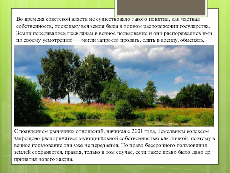 С появлением рыночных отношений, начиная с 2001 года, Земельным кодексом запрещено распоряжаться муниципальной собственностью как личной, поэтому в вечное пользование она уже не передается. Но право бессрочного пользования землей сохраняется, правда, только в том случае, если такое право было дано до принятия нового закона.
