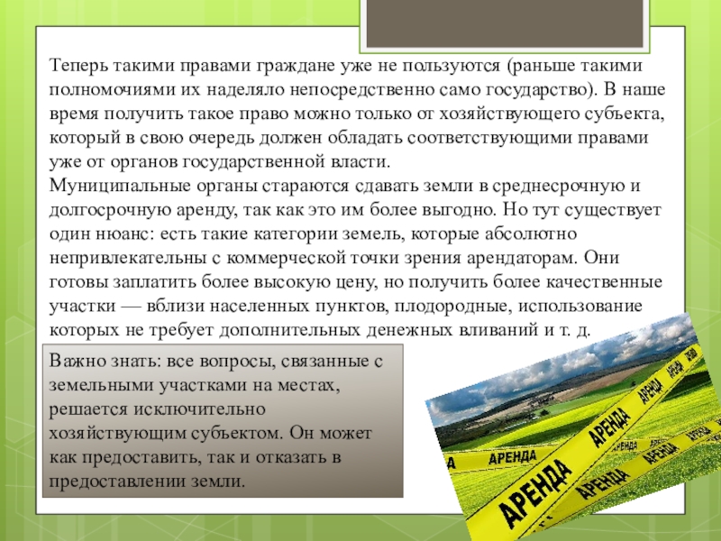 Важно знать: все вопросы, связанные с земельными участками на местах, решается исключительно хозяйствующим субъектом. Он может как предоставить, так и отказать в предоставлении земли.