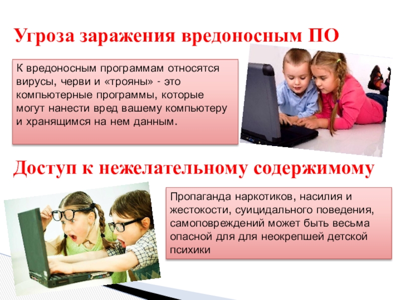 Предупредите ребенка о том, что в Сети он может столкнуться с опасным контентом (наркотики, порнография), киберунижением и злоумышленниками. При встрече с опасным контентом ребенок должен рассказать о нем родителям.