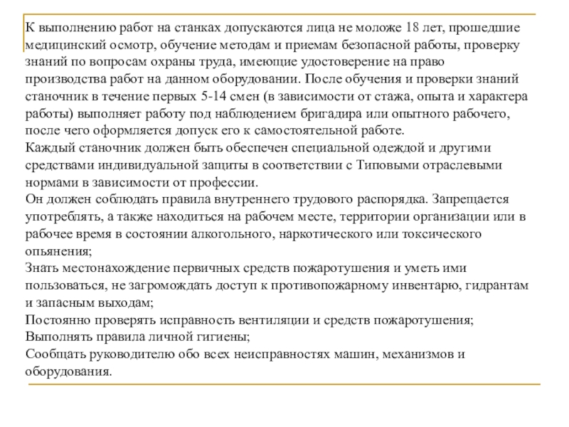 Слайд 4К выполнению работ на станках допускаются лица не моложе 18 лет,