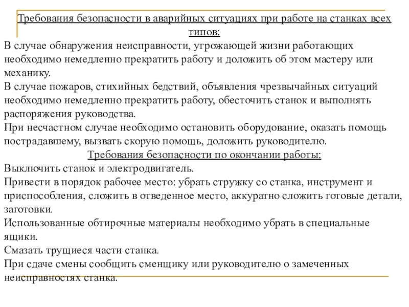 Слайд 8Требования безопасности в аварийных ситуациях при работе на станках всех типов: