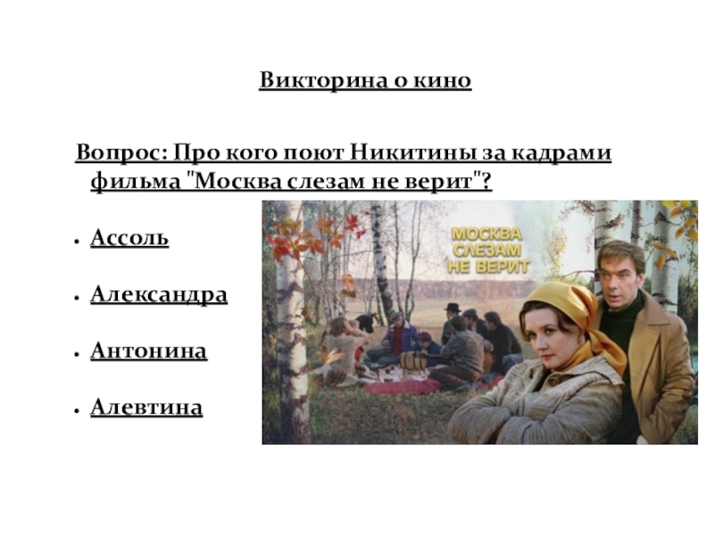 Слайд 72Вопрос: Про кого поют Никитины за кадрами фильма "Москва слезам не