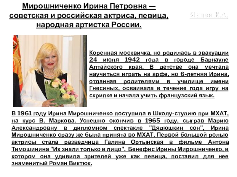 Слайд 29Мирошниченко Ирина Петровна — советская и российская актриса, певица, народная артистка России.