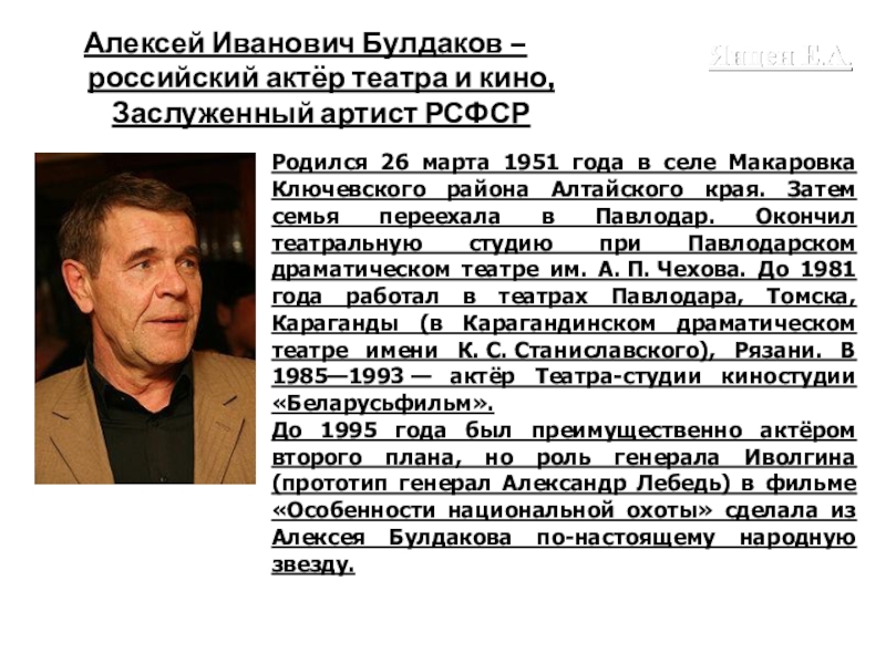 Слайд 34Алексей Иванович Булдаков – российский актёр театра и кино, Заслуженный артист