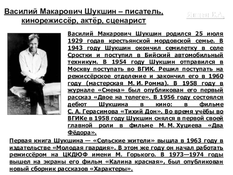 Слайд 31Василий Макарович Шукшин – писатель, кинорежиссёр, актёр, сценарист