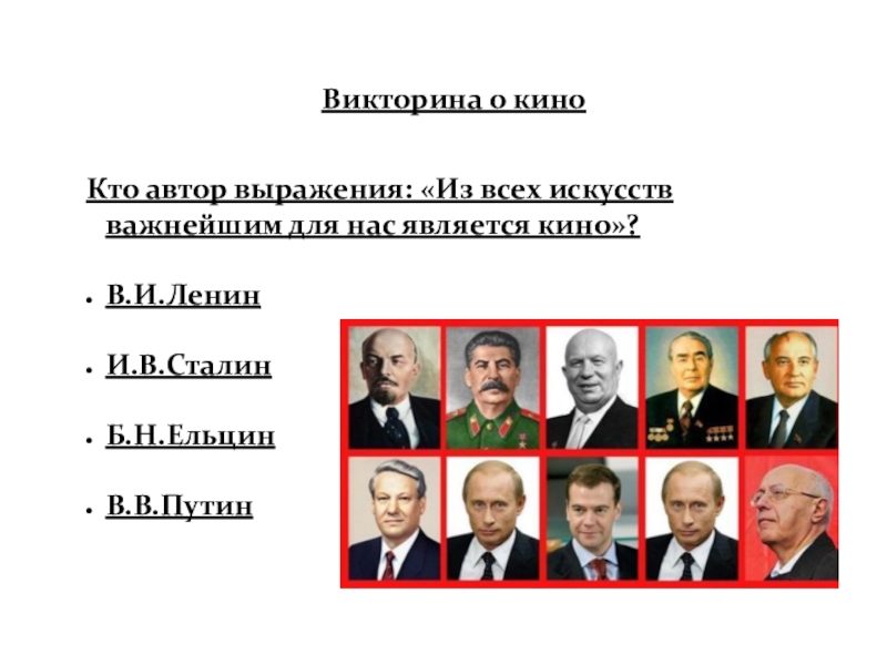 Слайд 52Кто автор выражения: «Из всех искусств важнейшим для нас является кино»?