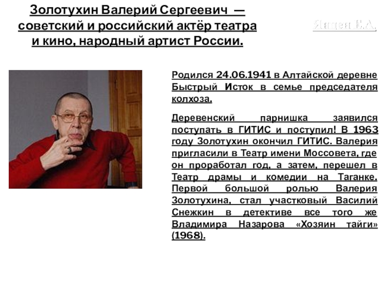 Слайд 26Золотухин Валерий Сергеевич — советский и российский актёр театра и кино,