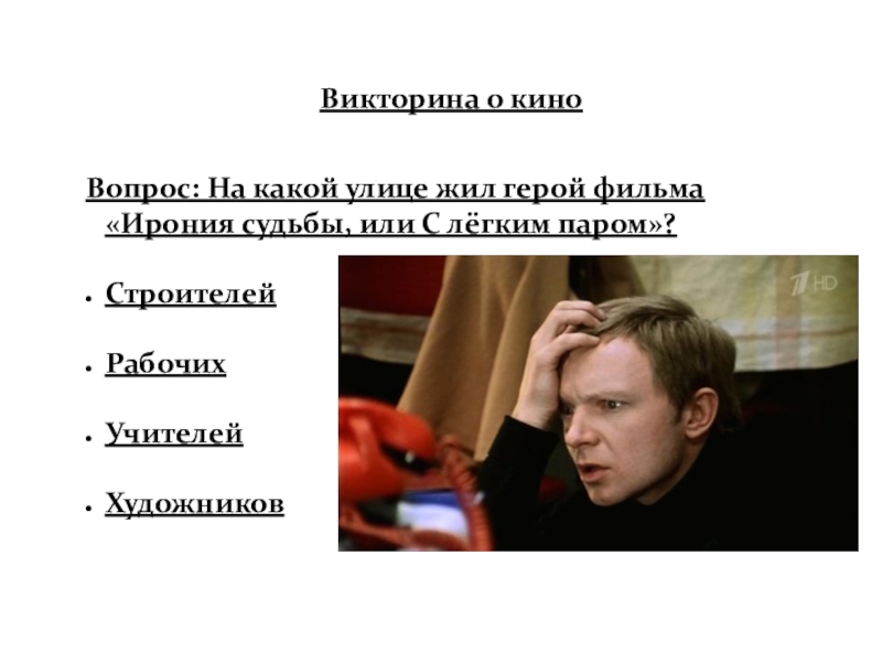 Слайд 60Вопрос: На какой улице жил герой фильма «Ирония судьбы, или С