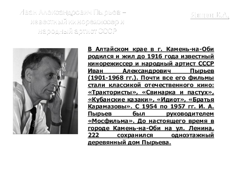 года известный кинорежиссер и народный артист СССР Иван Александрович Пырьев (1901-1968 гг.). Почти все его фильмы стали классикой отечественного кино: «Трактористы», «Свинарка и пастух», «Кубанские казаки», «Идиот», «Братья Карамазовы». С 1954 по 1957 гг. И. А. Пырьев был руководителем «Мосфильма». До настоящего время в городе Камень-на-Оби на ул. Ленина, 222 сохранился одноэтажный деревянный дом Пырьева.