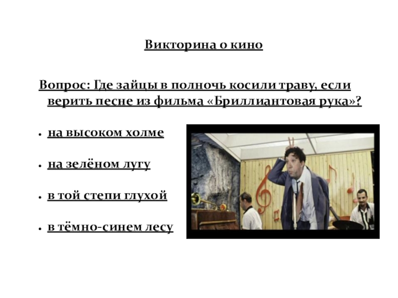 Слайд 62Вопрос: Где зайцы в полночь косили траву, если верить песне из