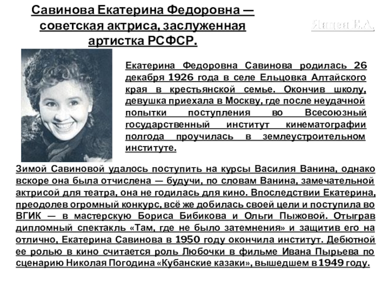 Слайд 28Савинова Екатерина Федоровна — советская актриса, заслуженная артистка РСФСР.