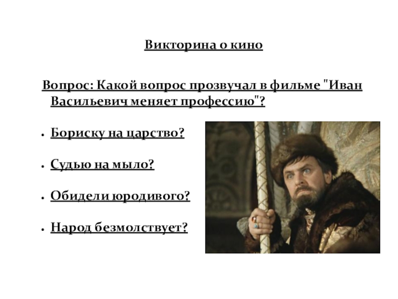 Слайд 70Вопрос: Какой вопрос прозвучал в фильме "Иван Васильевич меняет профессию"?