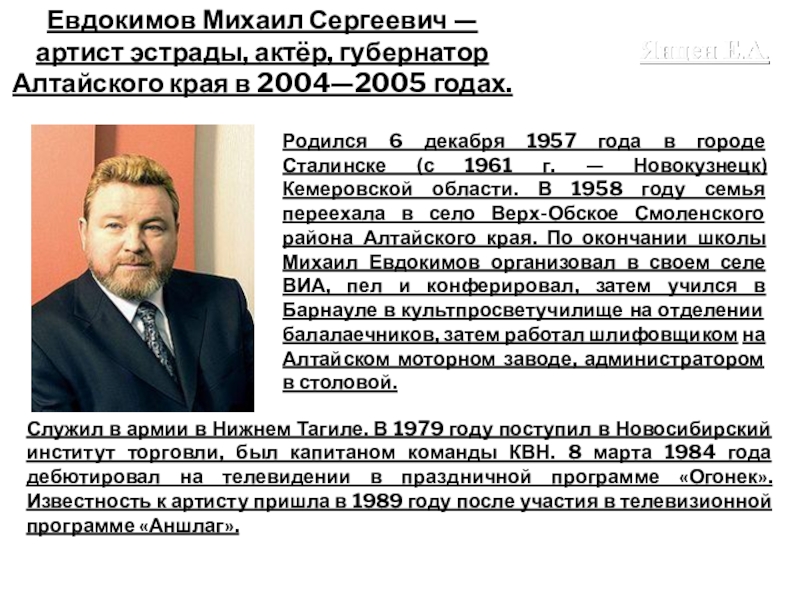Слайд 25Евдокимов Михаил Сергеевич — артист эстрады, актёр, губернатор Алтайского края в