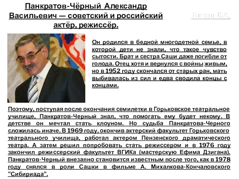 Слайд 27Панкратов-Чёрный Александр Васильевич — советский и российский актёр, режиссёр.