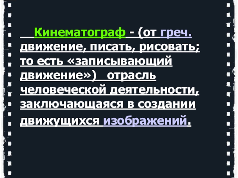 Кинематограф - (от греч. движение, писать, рисовать; то есть «записывающий движение»)