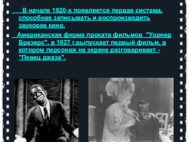 Американская фирма проката фильмов "Уорнер Бразерс", в 1927 г.выпускает первый фильм, в котором персонаж на экране разговаривает - "Певец джаза".