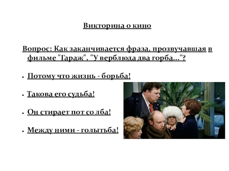 Слайд 68Вопрос: Как заканчивается фраза, прозвучавшая в фильме "Гараж", "У верблюда два