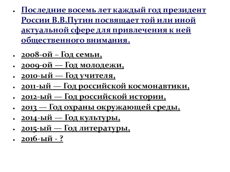 Слайд 2Последние восемь лет каждый год президент России В.В.Путин посвящает той или