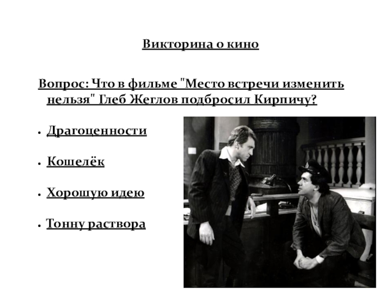 Слайд 56Вопрос: Что в фильме "Место встречи изменить нельзя" Глеб Жеглов подбросил