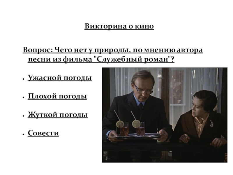 Слайд 64Вопрос: Чего нет у природы, по мнению автора песни из фильма