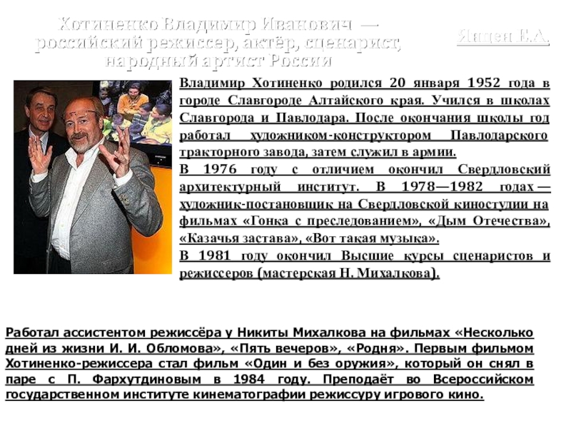 Слайд 33Владимир Хотиненко родился 20 января 1952 года в городе Славгороде Алтайского
