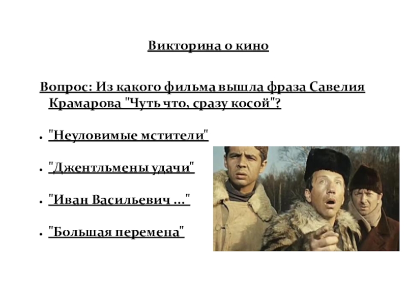 Слайд 58Вопрос: Из какого фильма вышла фраза Савелия Крамарова "Чуть что, сразу