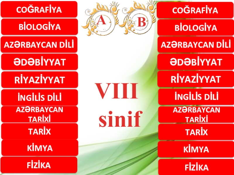 B AZƏRBAYCAN DİLİƏDƏBİYYATRİYAZİYYATİNGİLİS DİLİAZƏRBAYCAN TARİXİTARİXFİZİKABİOLOGİYACOĞRAFİYAAAZƏRBAYCAN DİLİƏDƏBİYYATRİYAZİYYATİNGİLİS DİLİAZƏRBAYCAN TARİXİTARİXFİZİKABİOLOGİYACOĞRAFİYAKİMYAKİMYAVIII sinif