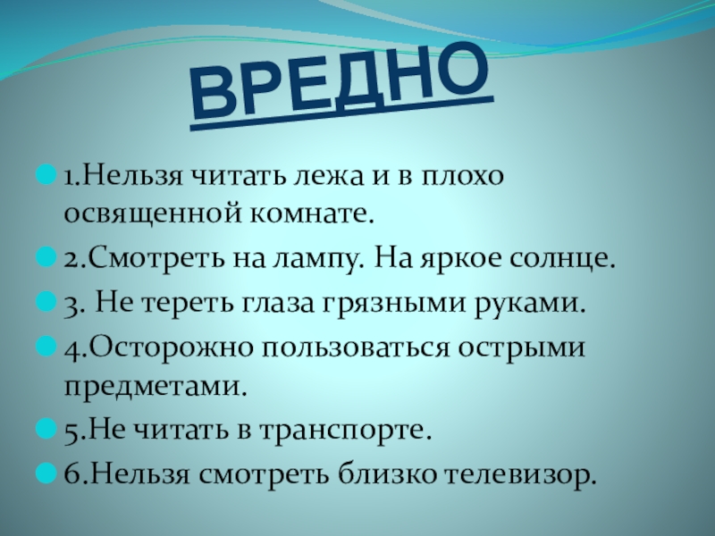 ВРЕДНО1.Нельзя читать лежа и в плохо освященной комнате.2.Смотреть на лампу. На яркое солнце.3. Не тереть глаза грязными