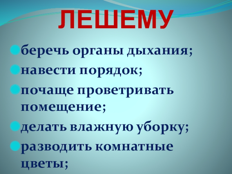 СОВЕТЫ ЛЕШЕМУберечь органы дыхания;навести порядок;почаще проветривать помещение;делать влажную уборку;разводить комнатные цветы;