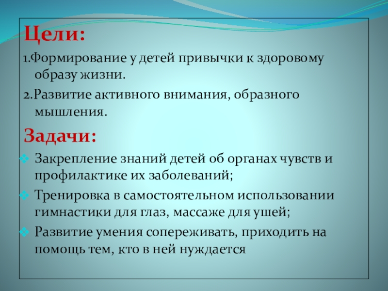 Цели:1.Формирование у детей привычки к здоровому образу жизни.2.Развитие активного внимания, образного мышления.Задачи:Закрепление знаний детей об органах чувств
