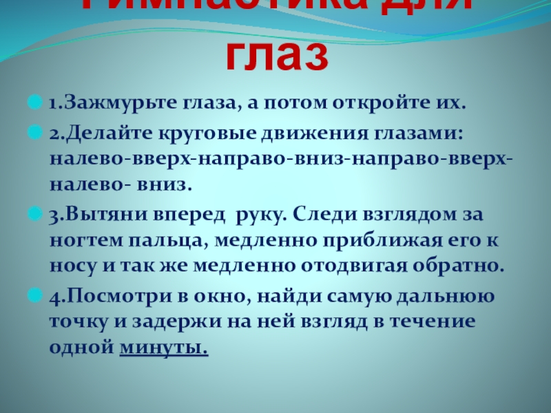 Гимнастика для глаз1.Зажмурьте глаза, а потом откройте их.2.Делайте круговые движения глазами: налево-вверх-направо-вниз-направо-вверх-налево- вниз.3.Вытяни вперед руку. Следи взглядом
