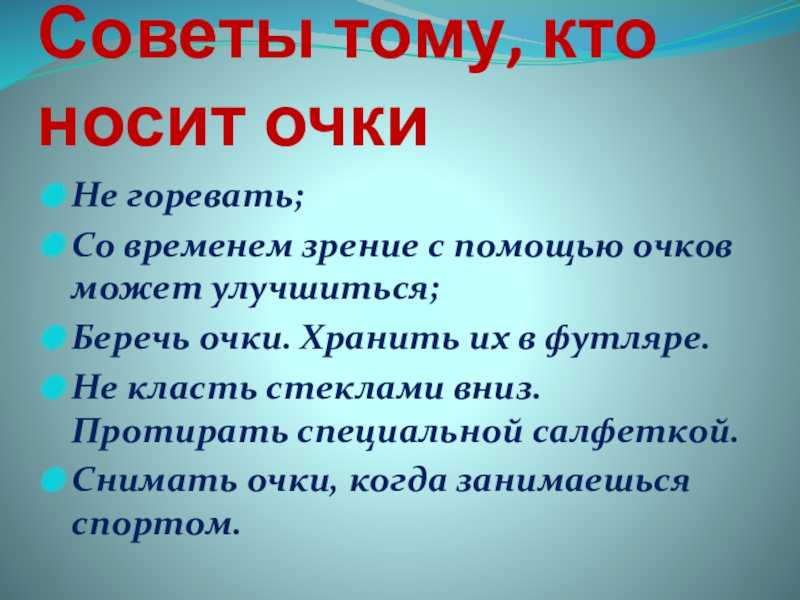 Советы тому, кто носит очкиНе горевать;Со временем зрение с помощью очков может улучшиться;Беречь очки. Хранить их в