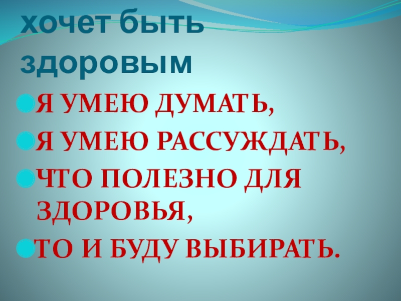 Девиз для тех, кто хочет быть здоровымЯ УМЕЮ ДУМАТЬ,Я УМЕЮ РАССУЖДАТЬ,ЧТО ПОЛЕЗНО ДЛЯ ЗДОРОВЬЯ, ТО И БУДУ