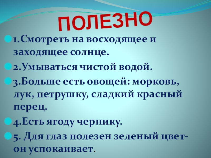 ПОЛЕЗНО1.Смотреть на восходящее и заходящее солнце.2.Умываться чистой водой.3.Больше есть овощей: морковь, лук, петрушку, сладкий красный перец.4.Есть ягоду