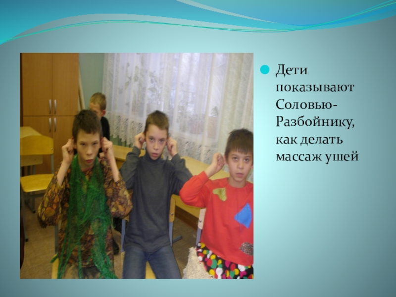 Дети показывают Соловью- Разбойнику, как делать массаж ушей