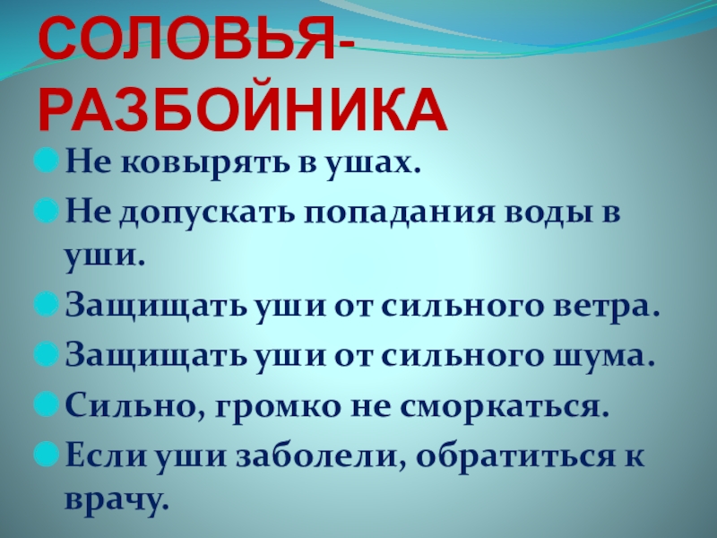 СОВЕТЫ ДЛЯ СОЛОВЬЯ- РАЗБОЙНИКАНе ковырять в ушах.Не допускать попадания воды в уши.Защищать уши от сильного ветра.Защищать уши