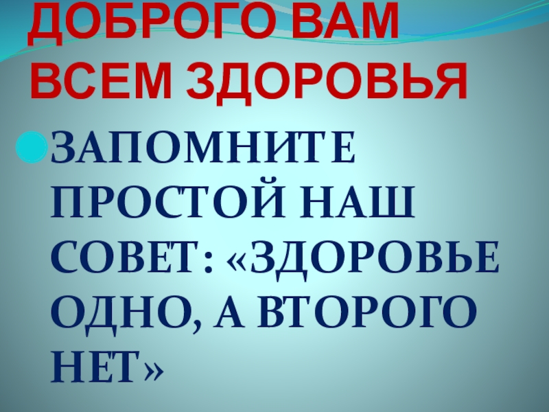 ДОБРОГО ВАМ ВСЕМ ЗДОРОВЬЯЗАПОМНИТЕ ПРОСТОЙ НАШ СОВЕТ: «ЗДОРОВЬЕ ОДНО, А ВТОРОГО НЕТ»