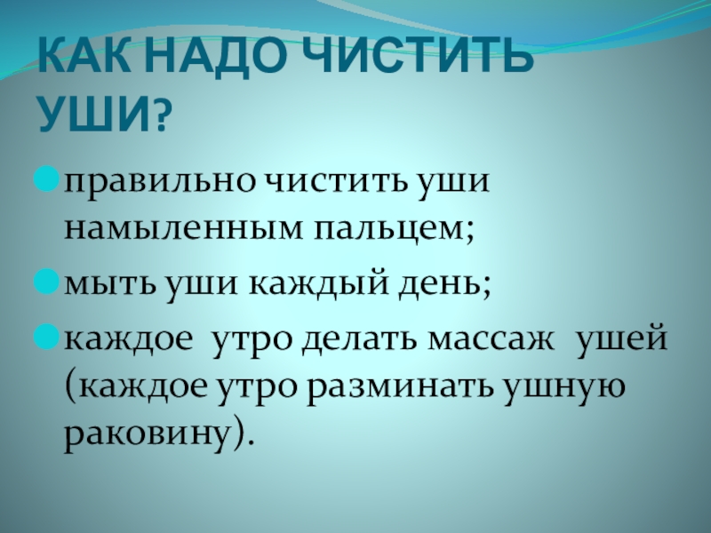 КАК НАДО ЧИСТИТЬ УШИ?правильно чистить уши намыленным пальцем;мыть уши каждый день;каждое утро делать массаж ушей (каждое утро