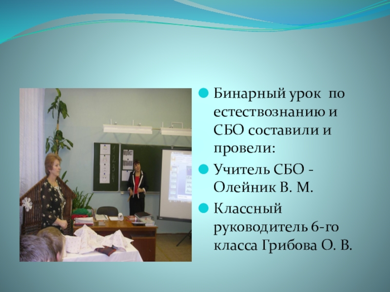 Бинарный урок по естествознанию и СБО составили и провели:Учитель СБО - Олейник В. М.Классный руководитель 6-го класса Грибова О. В.