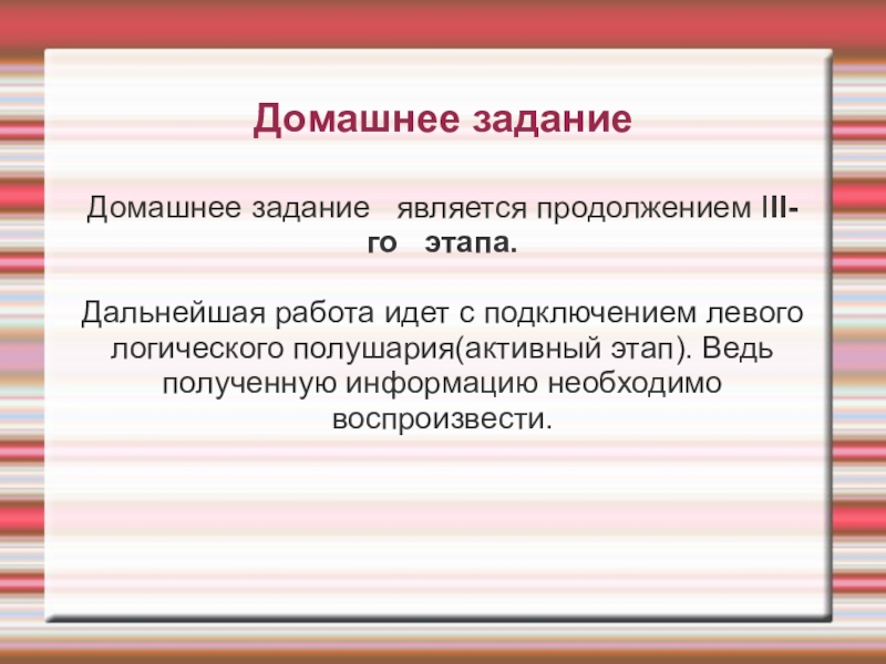 Домашнее заданиеДомашнее задание   является продолжением III-го   этапа.Дальнейшая работа идет с подключением левого логического полушария(активный этап).