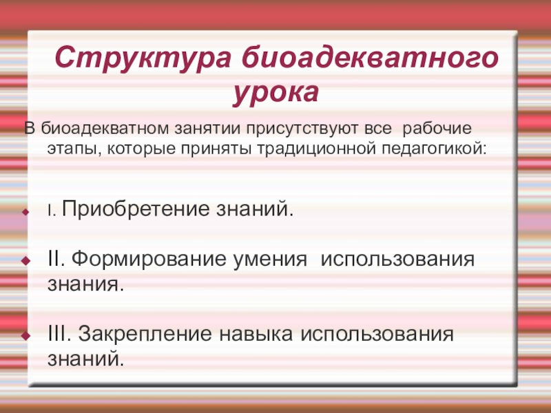 Структура биоадекватного урокаВ биоадекватном занятии присутствуют все рабочие этапы, которые приняты традиционной педагогикой:I. Приобретение знаний.II. Формирование умения