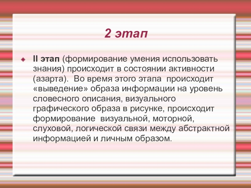 2 этапII этап (формирование умения использовать знания) происходит в состоянии активности (азарта). Во время этого этапа происходит