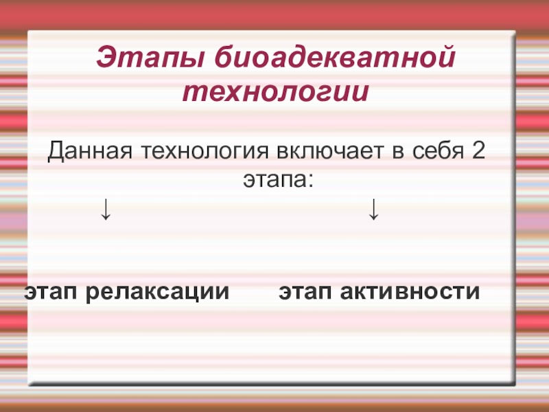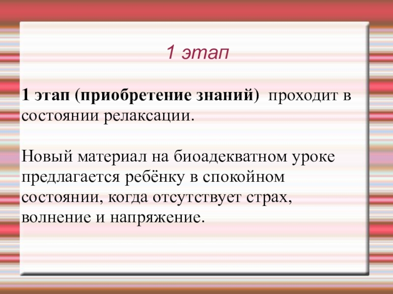 1 этап1 этап (приобретение знаний)  проходит в состоянии релаксации.Новый материал на биоадекватном уроке предлагается ребёнку в спокойном