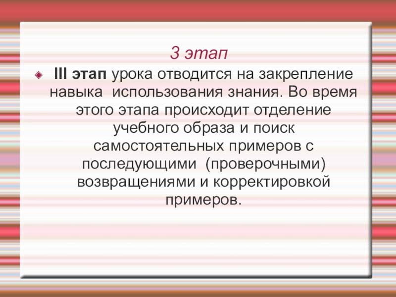 3 этапIII этап урока отводится на закрепление навыка использования знания. Во время этого этапа происходит отделение учебного
