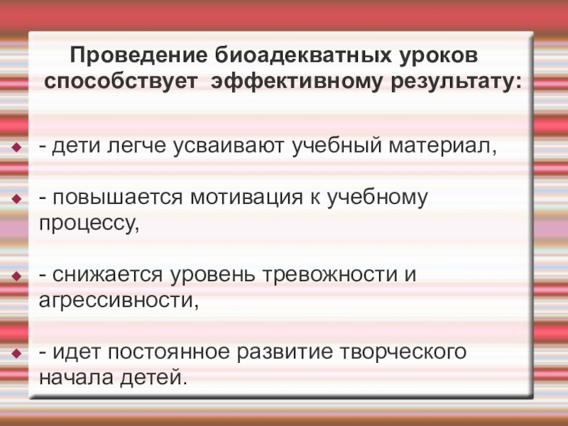 Слайд 10 Проведение биоадекватных уроков способствует эффективному результату: