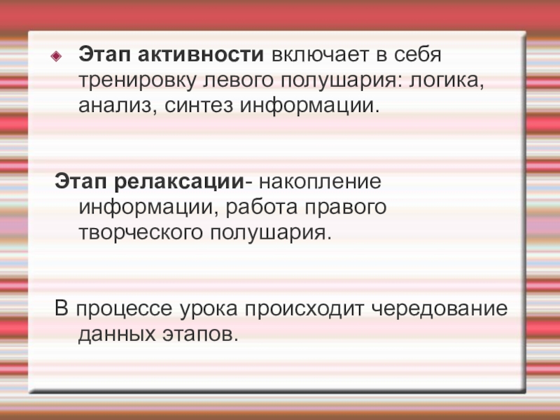 Этап активности включает в себя тренировку левого полушария: логика, анализ, синтез информации.Этап релаксации- накопление информации, работа правого